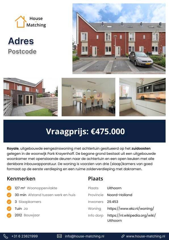 Vind je het ook zo lastig om een (nieuw) huis te vinden of ben je er simpelweg niet zo handig in? Lukt het niet om knopen door te hakken of heb je altijd wel iets op woningen aan te merken? Geef ons je woonwensen door en wij gaan voor je op zoek! Door gebruik te maken van House-Matching vind je je ideale huis en woonomgeving in slechts een paar stappen, gemakkelijk thuis vanaf de bank. Wij hanteren een out-of-the-box denkwijze en maken keuzes aan de hand van slechts enkele vragen om een idee te krijgen van jouw of jullie woonwensen.